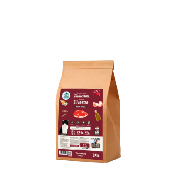 Naturextra Silvestre Black Angus es un pienso natural monoproteico para gatos de todas las razas, elaborado con un 70% de carne de Black Angus y prensado en frío. Rico en proteína de alta calidad, sin cereales y con 2000 mg/kg de taurina. Ideal para gatos exigentes, activos o con digestiones sensibles.