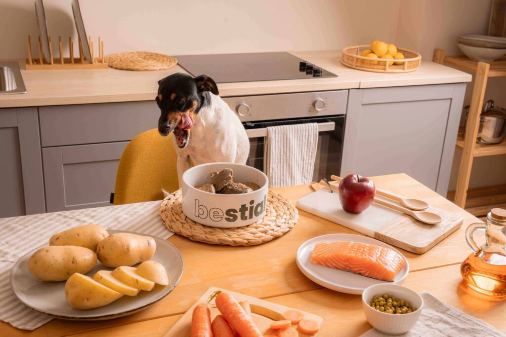 Menú natural cocinado, equilibrado y digestible, elaborado con cerdo, salmón y verduras. Proporciona proteínas de calidad y grasas saludables, ayudando a mantener la digestión y el bienestar general del perro
